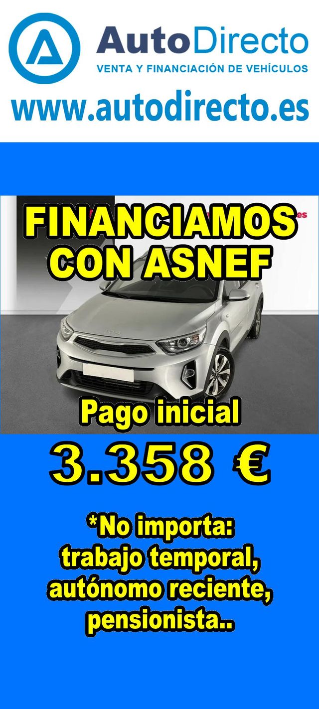Detalles del producto¿No consigues financiación? ¡Tenemos la solución! *************************************************************************** RENT CREDIT: Aprobamos más del 90% de las operaciones. No importa ASNEF o RAI, impagos pendientes, ser autónomo o empresa reciente, ser pensionista. Imprescindible pago inicial del 20%. Ejemplo de operación: KIA STONIC 1.2 84CV CONCEPT. Ref. W956425MRG - Precio vehículo financiado: 16790 €. - Pago inicial de 3358 €. - Cuota mes desde 352 €. - Impuesto de circulación y garantía (mínimo 1 año) incluidos. *************************************************************************** ✅ Más de 3.000 COCHES Y FURGONETAS EN STOCK. ✅ HASTA 2 AÑOS DE GARANTIA. ✅ Kilómetros certificados. ✅ 17 concesionarios repartidos en toda España. ♻️ Aceptamos tu coche como parte del pago. *************************************************************************** IMPORTANTE: -. Este anuncio, no es vinculante, puede contener errores. SE MUESTRAN A TÍTULO INFORMATIVO Y NO CONTRACTUAL. -. Consultar disponibilidad del vehículo y datos exactos: fecha de matriculación, importes, etc,... *************************************************************************** Te ofrecemos distintas opciones: financiación, renting, alquiler con opción a compra, rent credit. En nuestro stock disponible encontraras: 3008 , qashqai , corolla , rav4 , sandero , Duster , yaris , 2008 , Tucson , Ibiza , 208 , Sportage , a3 , c4 , Formentor , q3 , yaris cross , 500 , c3 , arona , zs , x1 , kona , corsa , clase a , león , 308 , serie 1 , golf , focus , captur , a1 , tiguan , i20 , t roc , stonic , xc40 , civic , q5 , serie 3 , glb , 5008 , ateca , clio , kuga , c hr , i30 , arkana , juke , a4 , x3 , cx 5 , xc60 , kamiq , taigo , Mustang , x6 , polo , ceed , karoq , x2 , Astra , niro , cx 30 , a5 , cooper , megane , moka , fiesta , hs , q2 , clase c , serie 3 , renegade , picanto.