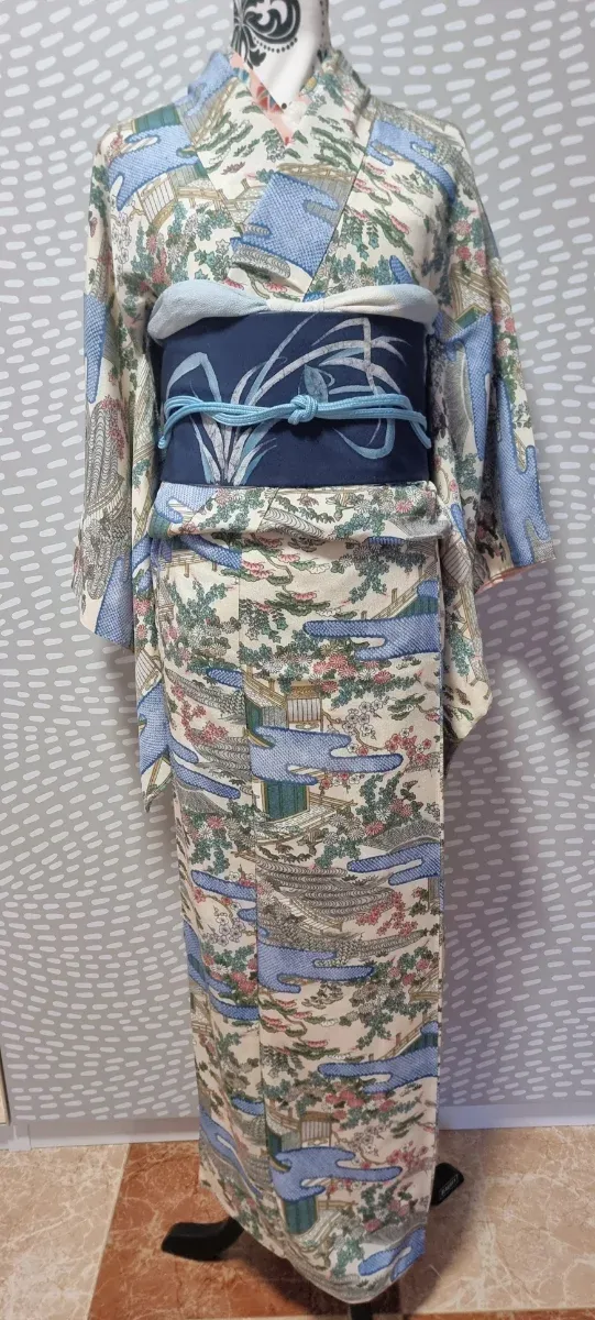 Kimono japonés komon de seda blancp y azul.