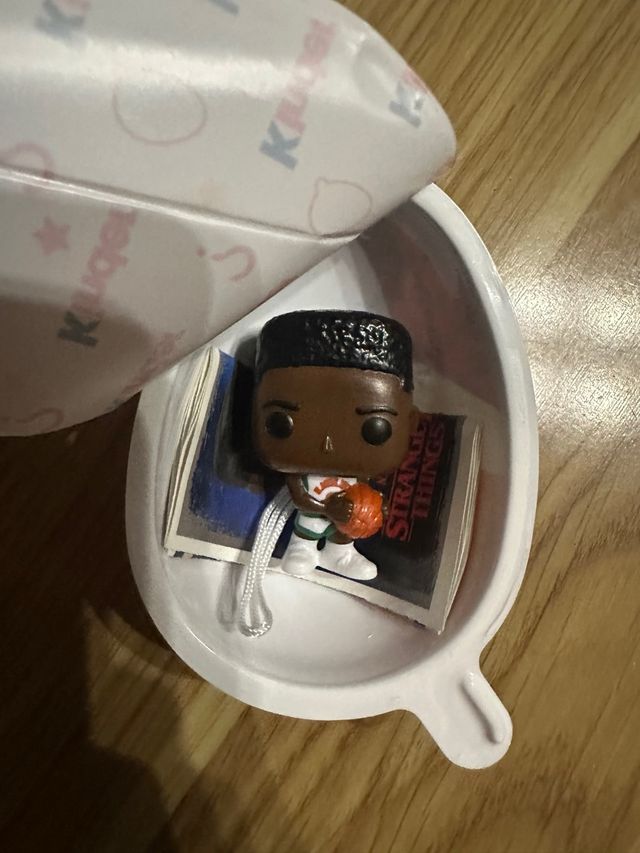 Figura coleccionable de Lucas de Stranger Things, proveniente de un Kinder Joy. - Figura tipo Funko Pop. - Incluye accesorios temáticos de la serie.