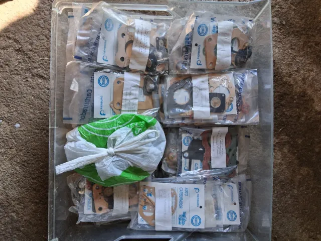 Conjunto de juntas y repuestos para la reparación de carburadores de vehículos clásicos.