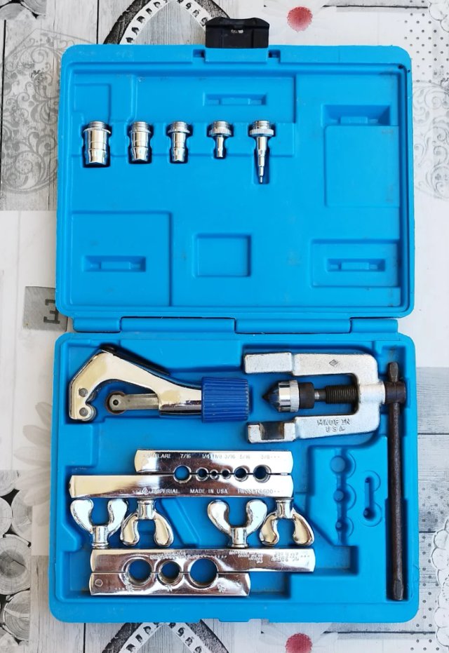 Kit de abocardador de la marca Imperial. - Incluye cortatubos. - Incluye conos y adaptadores para diferentes medidas. - Fabricado en USA.