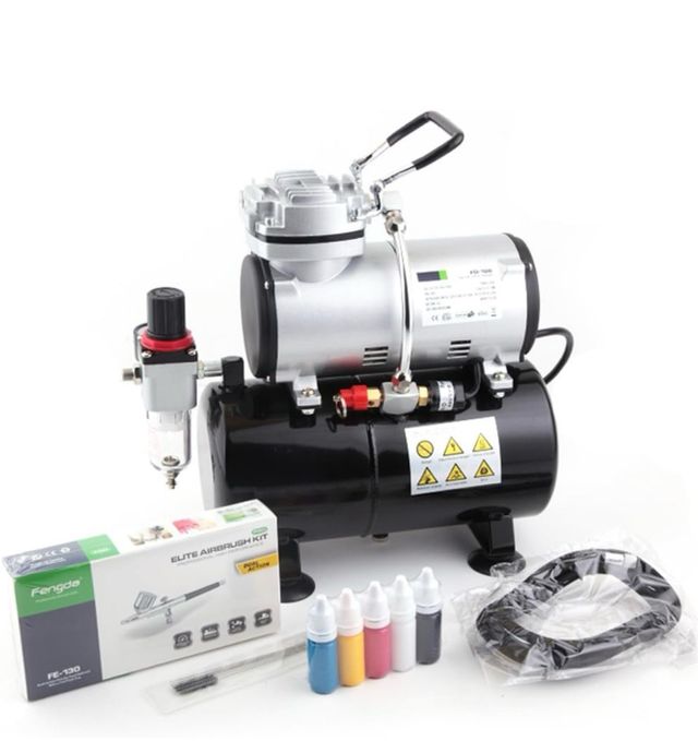 Detalles del productoEste kit incluye un aerógrafo y un compresor FD-186K. El compresor es compacto y de color negro y plateado, con un asa para facilitar su transporte. El aerógrafo es de doble acción.