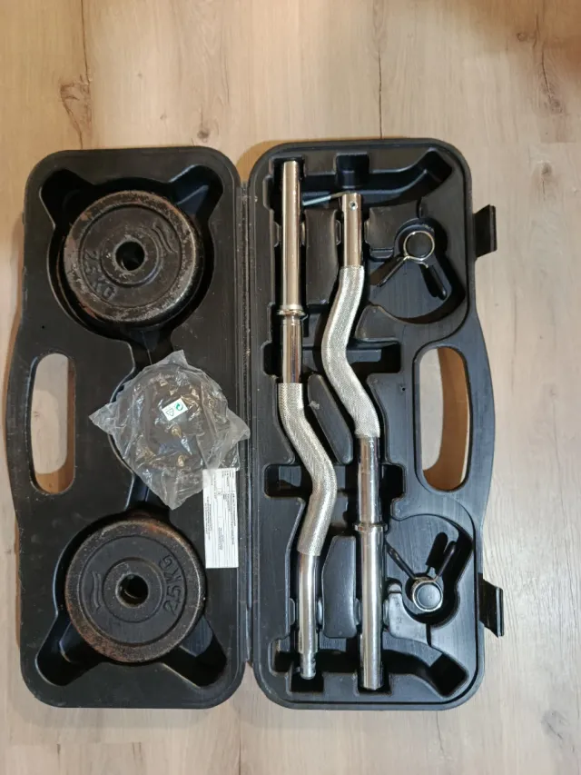 Detalles del productoSet de barra EZ con discos metal, cierres y funa de transporte