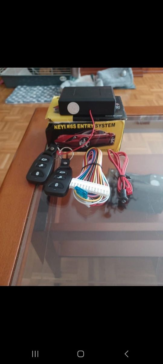 Kit de cierre centralizado para coche con dos mandos a distancia. - Centralita de control. - Cableado completo. - Dos llaves con mando. - Fusible de protección.