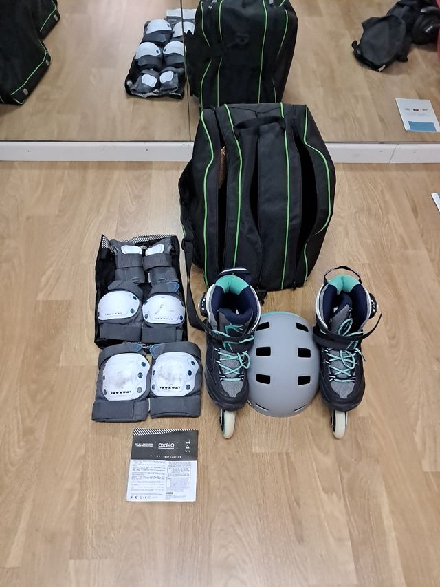 Detalles del productoKit de patinaje, con patines talla 39(tiene algún rallon pero ninguno que afecte), casco, rodilleras, coderas y muñequeras de la marca oxelo con signos de uso y una bolsa nueva para poder guardar todos los accesorios nombrados. Se pueden comprar todos los productos juntos que serían 55€ o por separado cada producto y me preguntan sin problema cuanto sería.