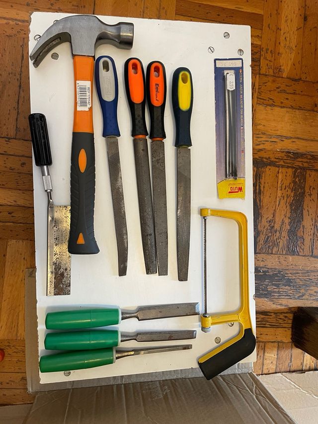 Conjunto de herramientas manuales para diversos trabajos. -cincel - Martillo. - Juego de 5 limas. - Serrucho. - Juego de 3 formones. - Punzón.
