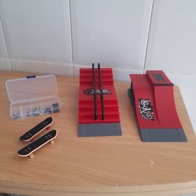 Kit de dos mini skates de dedo, dos rampes, caja con ruedas, tuercas, destornillador y tornillos