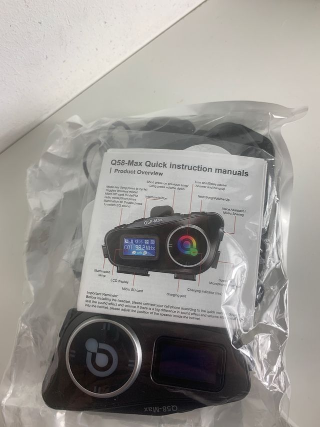 Kit de comunicación para moto Q58-Max. - Intercomunicador para casco. - Pantalla LCD. - Puerto de carga. - Indicador de carga LED.