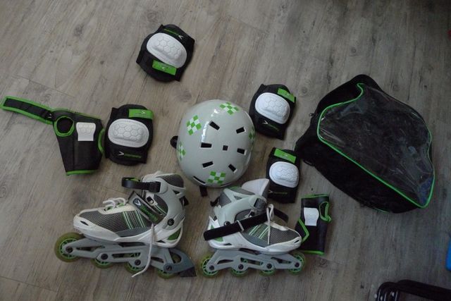 Detalles del productoPatines de niño. Abec 3 (iniciación pero no son sólo un juguete). Talla 35 a 38 pues se puede extender la bota usando una palanca en la suela. Muy buen estado. El interior está perfecto. Se incluye bolsa, casco, protectores de manos, de rodillas y de codos (ver la primera fotografía). Incluyo todo pues es un kit que va a juego.