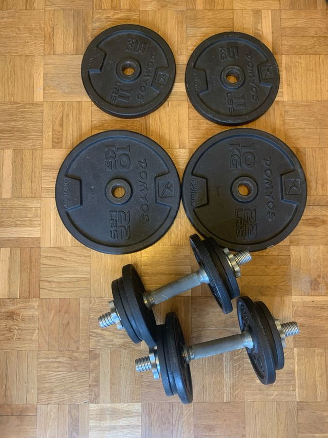 Detalles del productoKit de pesas y discos para entrenamiento en casa.
