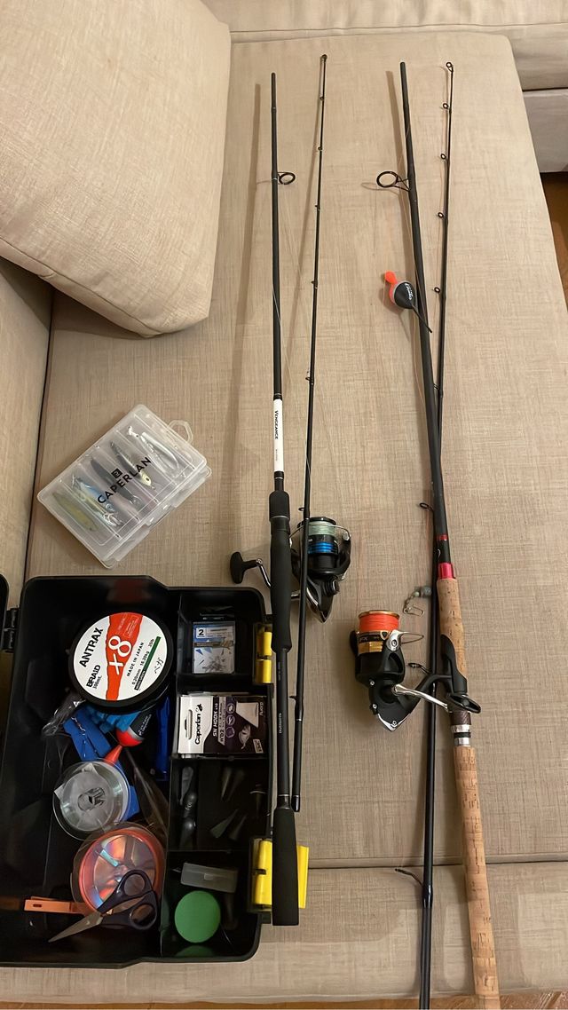 Conjunto de pesca con varios (CAÑA ROJA VENDIDA ) - Cañas de pescar. - Carretes. - Señuelos variados. - Hilo de pesca. - Caja de pesca por separado negra (100)