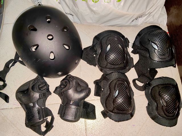 Kit de protección completo para deportes. - Casco negro con ventilación. - Rodilleras y coderas negras con protección. - proteccion de manos