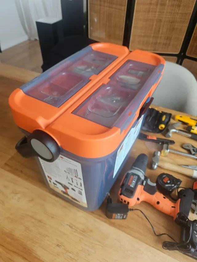 - Incluye: brocas para madera/metal/mampostería, puntas, llaves allen, martillo, cutter, alicates, nivel, cinta métrica, llave inglesa, etc.