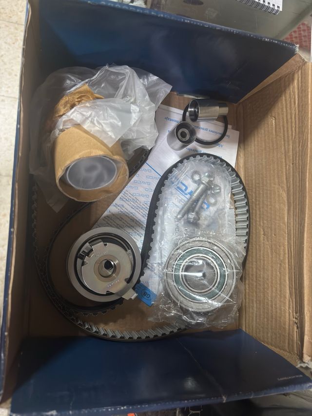 Kit de distribución y bomba de agua para coche. - Correa de distribución dentada. - Rodillo tensor. - Rodillo guía. - Bomba de agua.