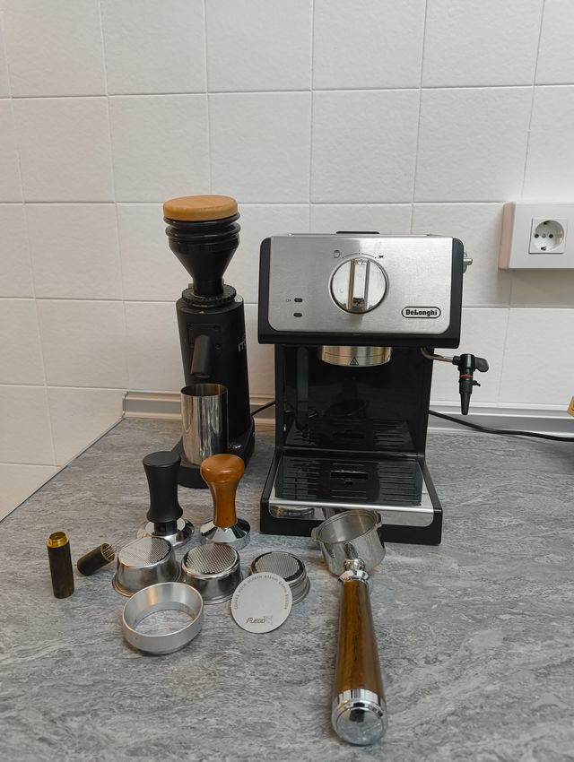 -Accesorios para espresso: wdt, portafiltro sin fondo mhw 3bomber, canasta despresurizada genérica, canasta IMS precision para dosis de 16g -20g, canasta NEOUZA despresurizada para dosis menores 14g -15g, puck screen fuego, 2 tampers de 51mm uno con muelle y otro sin, anillo dosificador.