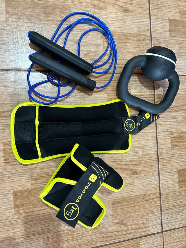 Detalles del productoVendo kit fitness como nuevo, ideal para entrenar en casa. Incluye una Rusa de 4 kg, dos pesas de tobilleras de 1 kg cada una y una cuerda para saltar. Las pesas están en perfecto estado y la cuerda es de color azul.