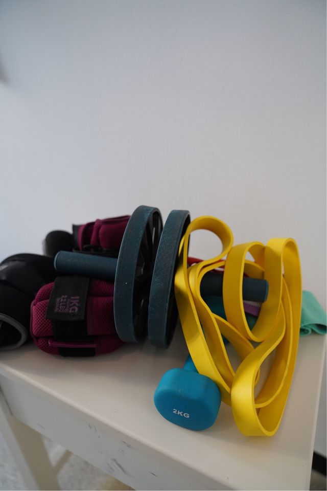 Conjunto de accesorios para entrenar en casa. - Rueda abdominal. - Mancuernas de 2 kg. - Bandas elásticas. - Pesos para tobillos de 1 kg.