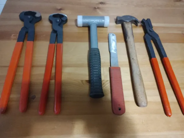 Kit de herrador con varias herramientas esenciales para el cuidado equino.