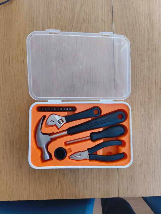 - Incluye martillo, alicates, llave inglesa y destornillador.