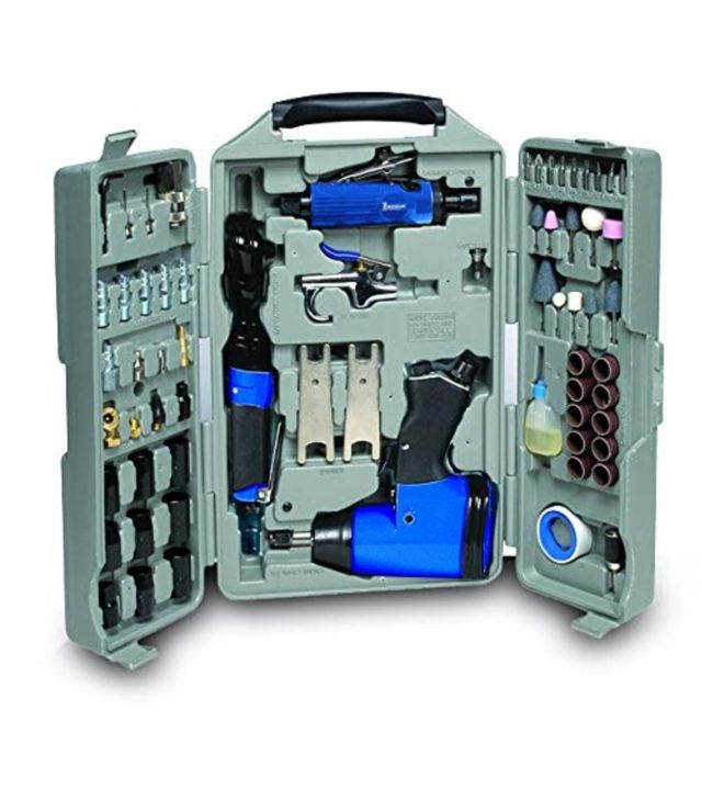 CONTENIDO: un atornillador neumático de percusión, una llave de trinquete, una amoladora recta, una pistola de soplado/inflado