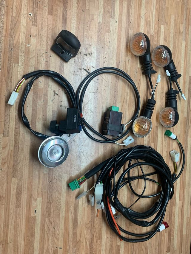 Detalles del productoKit de instalación eléctrica para motocicleta o quad, ideal para pasar la ITV. Instalación completa con intermitentes, mando intermitentes+warning, centralita, bocina y luz matrícula con soporte