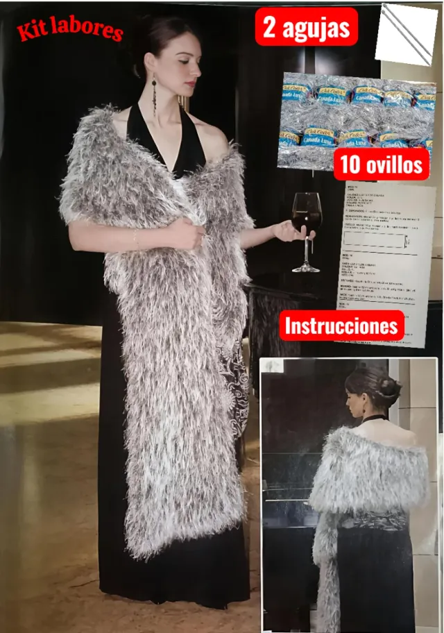 Kit para tejer un chal con lanas de fantasía. - Incluye 10 ovillos de lana. - Incluye 2 agujas aluminio de tejer. - Incluye instrucciones.