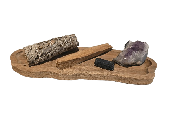 Incluye sahumerio de salvia blanca, palo santo de Perú, turmalina negra y drusa de amatista, creando un ritual perfecto para eliminar energías negativas y atraer paz y armonía.