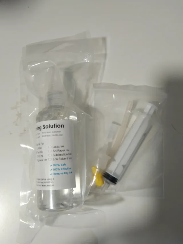 Detalles del productoKit de limpieza para impresoras que incluye una solución limpiadora y jeringas.