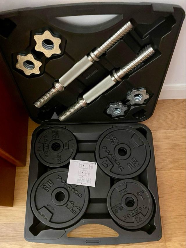 Detalles del productoKit de mancuernas con dos barras y doce discos de peso, con su maletín