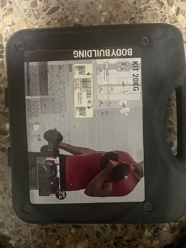 Kit de pesas para entrenamiento de fuerza. - Incluye dos mancuernas. - Peso total del kit: 20 kg. - Ideal para culturismo y ejercicios en casa.