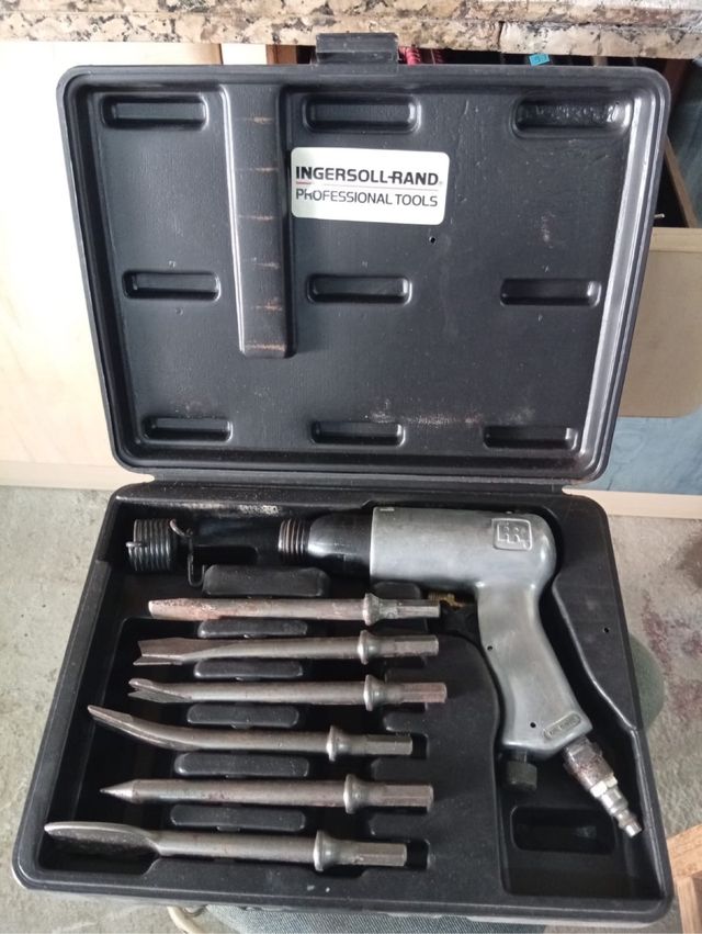 Kit de martillo neumático de la marca Ingersoll Rand. - Incluye martillo y cinceles. - Ideal para trabajos de demolición y corte.