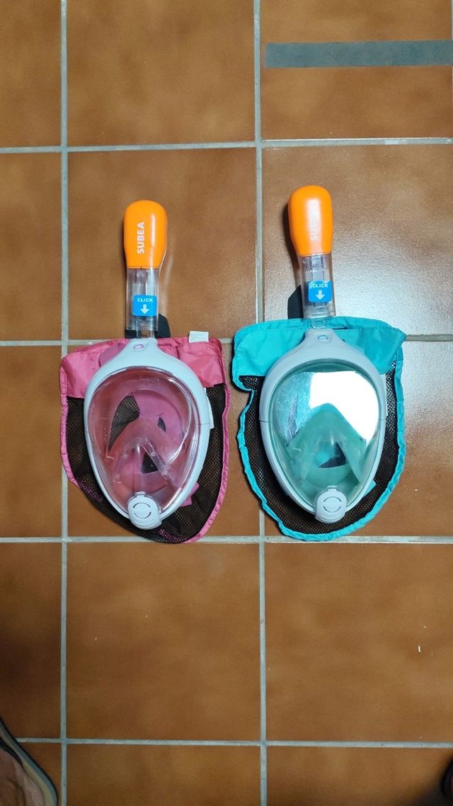 Detalles del productoKit 2 máscaras de buceo para niños de Decathlon que incluyen sus bolsas de transporte. 1 rosa y 1 turquesa