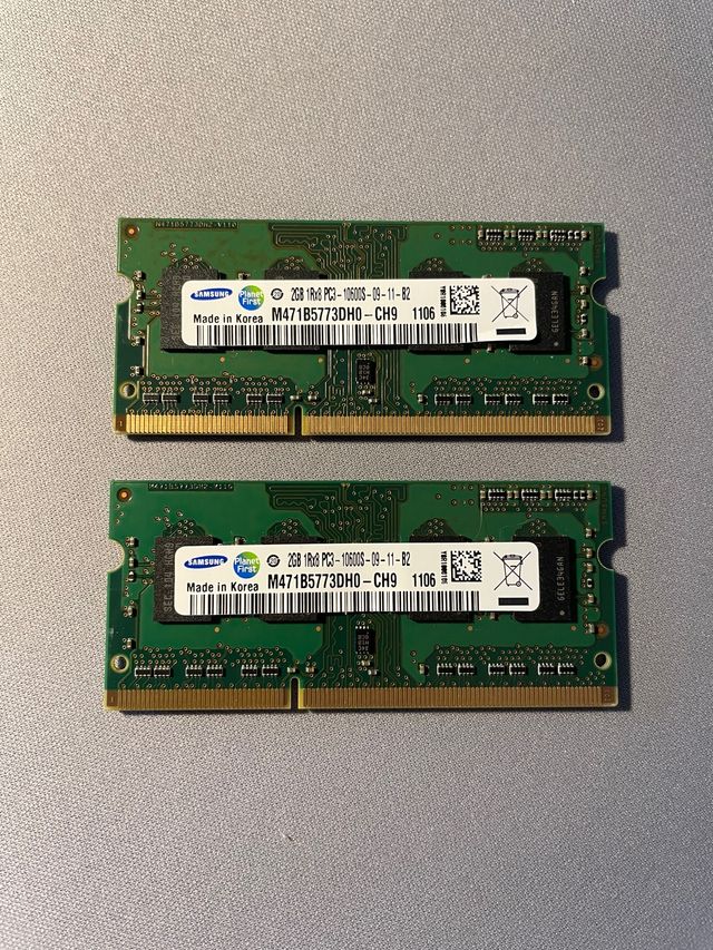 Vendo 2 módulos de memoria SODIMM de 2Gb PC3-10600-09-11-B2 para ordenadores portátiles. Para ciertos MacBooks, también son válidas (comprovar compatibilidad de modelos).