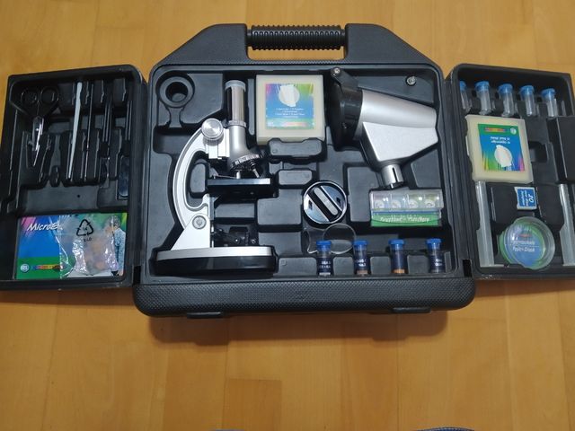 Detalles del productoKit microscopio completo, a falta de unas pinzas comunes, en perfecto estado. Incluye el propio microscopio, tubos para depositar los objetos a analizar, bandas para analizar otros objetos, instrumentos de medición, 4 botes con distinto contenido originales del kit, distintos instrumentos como mini cuchillos, una pequeña lupa, un aparato para observar de cerca, etc.