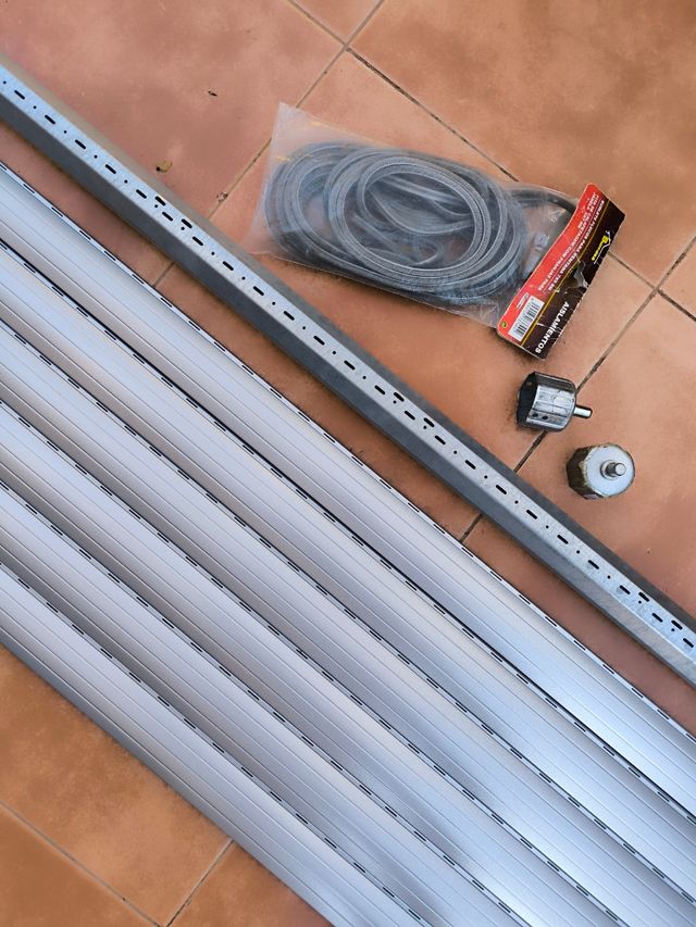 Se vende kit de persiana de aluminio. Está prácticamente nuevo. - Incluye 2 guías de aluminio. - 5 lamas grises. - Juego de cuerdas y 4 tapones. - 4 fijadores.