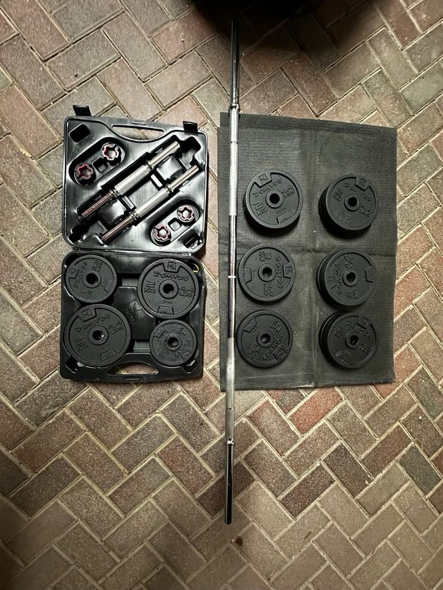 Detalles del productokit compuesto por maletin de 2 mancuernas de 20kg, cada mancuerna 10. 16 discos de 2kg y una barra de 150cm hacen un peso total de 36kg.