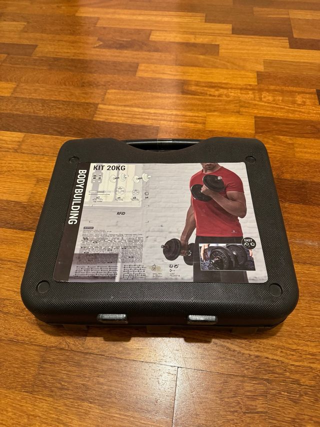 Detalles del productoKit de pesas de 20Kg para entrenamiento de fuerza en casa o gimnasio. Incluye maletín para fácil transporte y almacenamiento.
