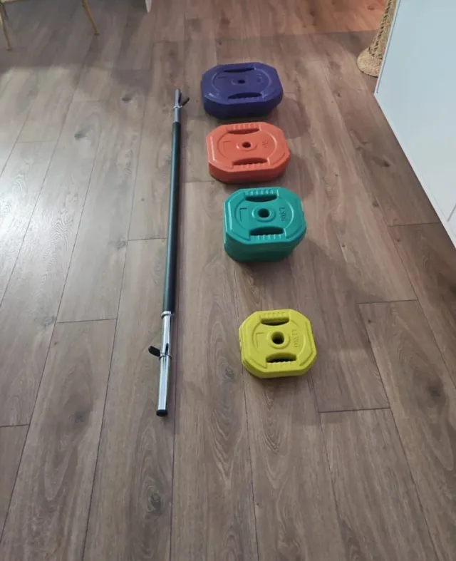 - Cuatro discos de pesas de diferentes colores: azul, naranja, verde y amarillo.