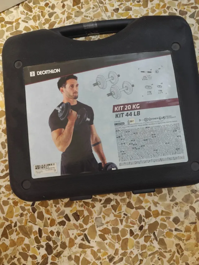 Kit de pesas para gimnasio de 20 kg (44 lb) de la marca Decathlon. - Incluye barras y discos. - Ideal para entrenamientos en casa.