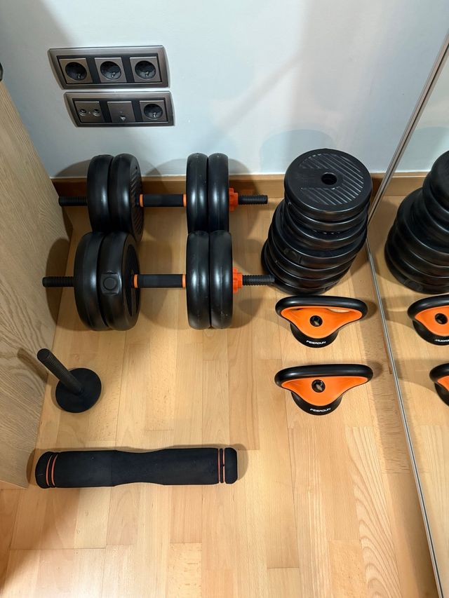 - Discos de diferentes pesos: 8 de 3kg, 4 de 2,5kg y 4 de 1,25kg