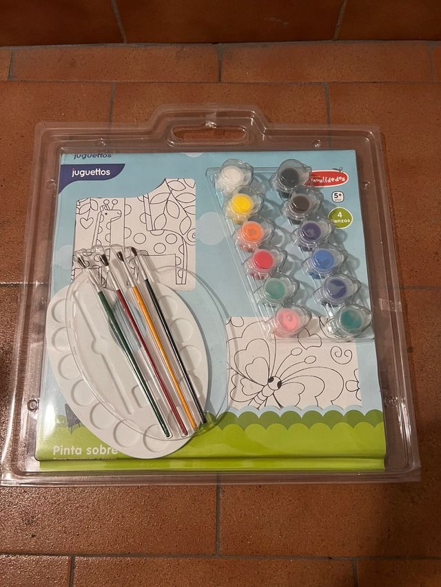 Viene todo lo necesario para pintar los dibujos. Incluye: pinceles de distintos tamaños, pinturas, paletas y 4 lienzos.