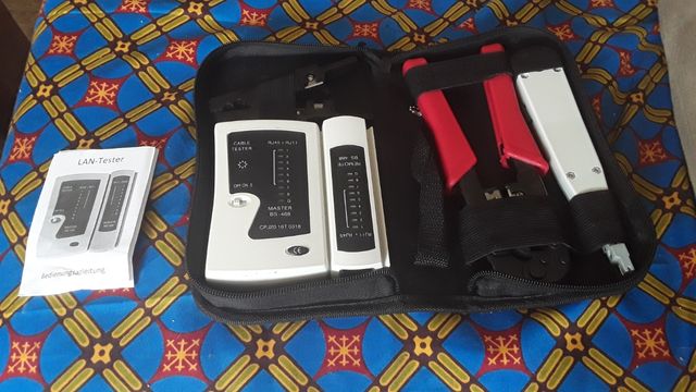 Detalles del productoVendo kit de prueba de cables de red LAN. Está en perfecto estado y listo para usar. Incluye dos probadores, una herramienta de crimpado y un estuche de transporte.
