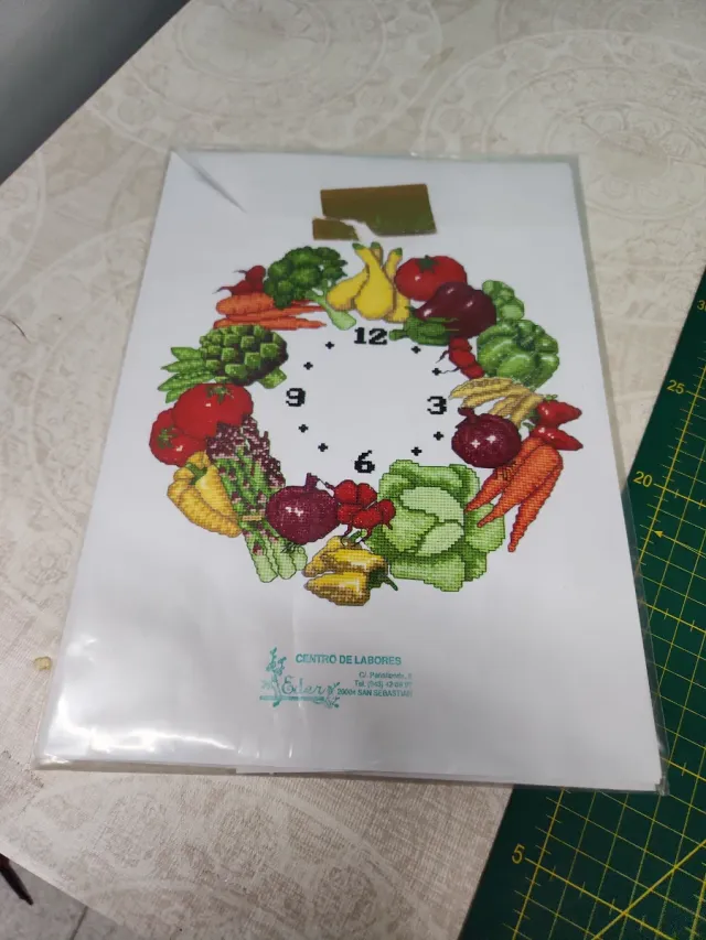 Detalles del productoKit de punto de cruz con diseño de frutas y verduras formando un reloj.