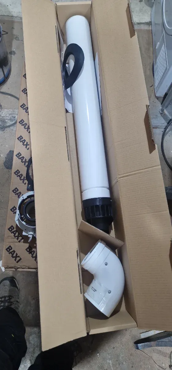 Detalles del productoKit de salida de humos para caldera de condensación Baxi. Incluye los componentes necesarios para la instalación.