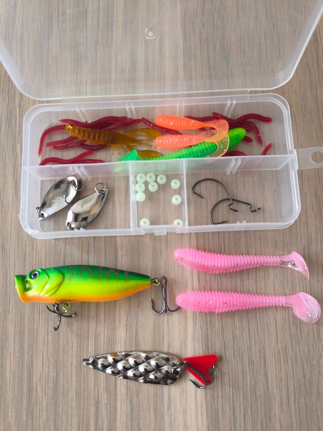 - Anzuelos, floppers, cebos de goma y pequeños accesorios.