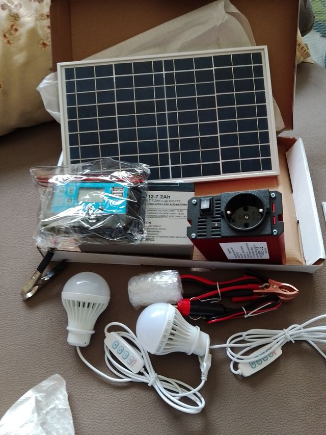 Detalles del productoKit solar portátil, ideal para situaciones de emergencia o zonas sin electricidad. Incluye panel solar, inversor de 220V, batería de 12-7.2Ah, dos bombillas LED y cables. El kit está nuevo a estrenar y listo para usar.