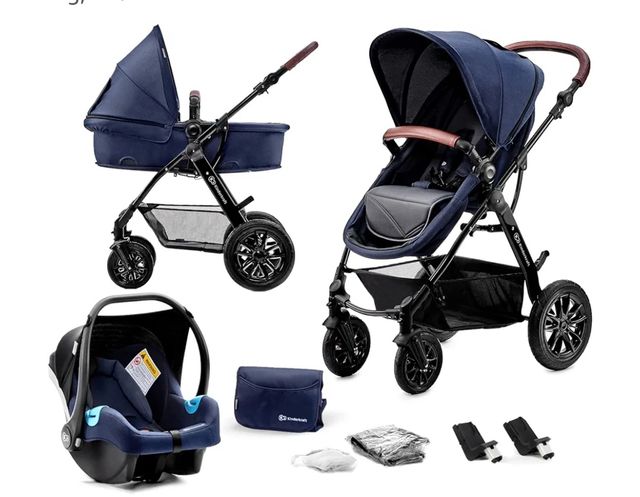 Conjunto de cochecito Kinderkraft en color azul marino. Incluye capazo, silla de paseo y silla de coche.