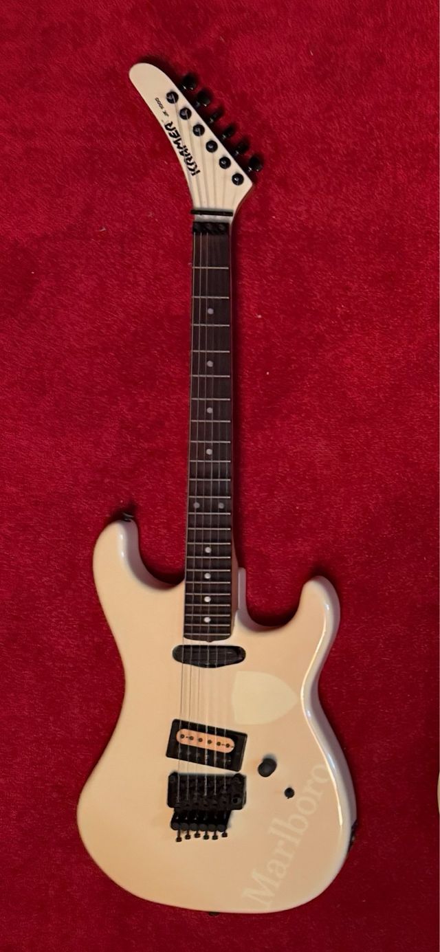 Kramer JK1000...hecha por la ESP en Japón en el año 1989, con pastillas Kramer Dual rail y KP-100 (hecha por ESP). Con pala invertida, muy poco frecuente de encontrar. Floyd Rose original. Cuerpo de arce, mástil de arce