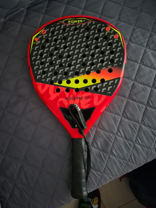 Pala de pádel Kuikma Power Light con un diseño llamativo en rojo, amarillo y negro. - Superficie con patrón de puntos. - Empuñadura negra. - Correa de seguridad.