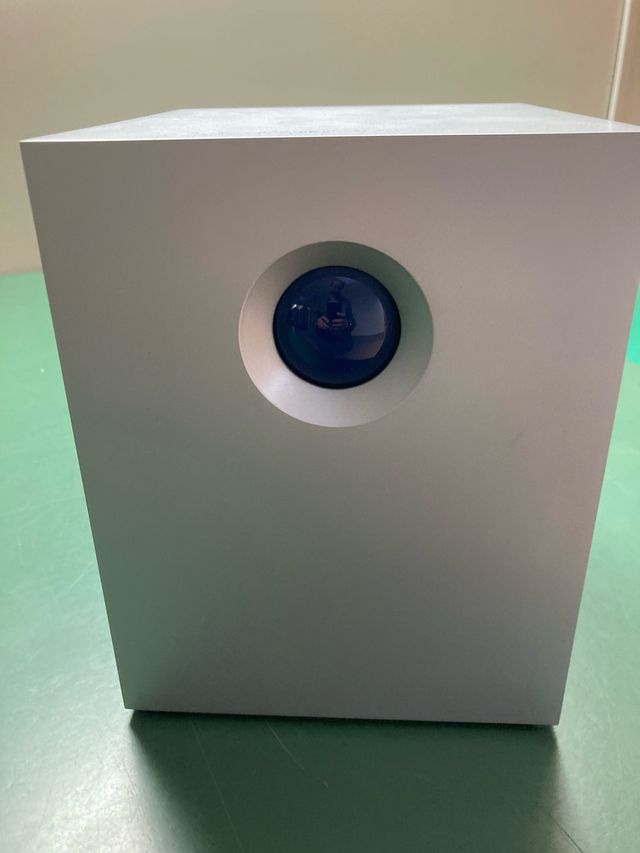 Dispositivo NAS LaCie 5big Network 2. - Diseño cúbico en color blanco. - Esfera azul frontal.